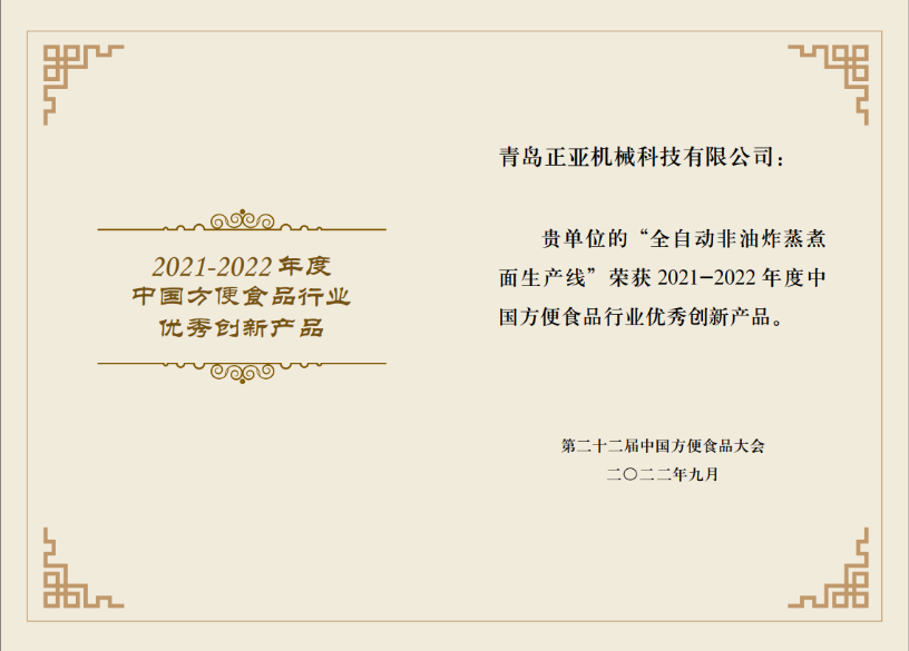 我司作為參會(huì)方,非常榮幸的在第二十二屆中國(guó)方便食品大會(huì)以“全自動(dòng)非油炸蒸煮面生產(chǎn)線”榮獲2021-2022年度中國(guó)方便食品行業(yè)優(yōu)秀創(chuàng)新產(chǎn)品獎(jiǎng)。